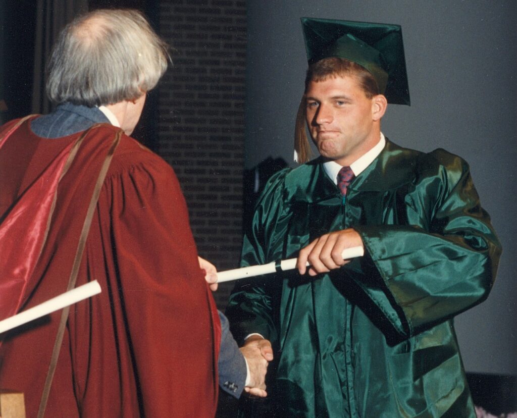 Chad Munger at his graduation from Michigan State University with his maternal grandparents, Helen and Richard Johnson. Richard is a 1937 alum of Michigan State University, then known as Michigan State College of Agriculture and Applied Science, and taught forestry at the university until the 1940s. Both grandparents donated their bodies to MSU and are buried at MSU’s East Lawn Memorial Gardens.