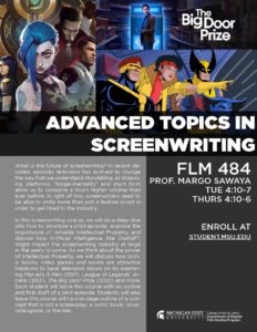FLM 334 Introduction to Screenwriting introduces undergraduate students to screenwriting and allows students to begin a screenplay project.
